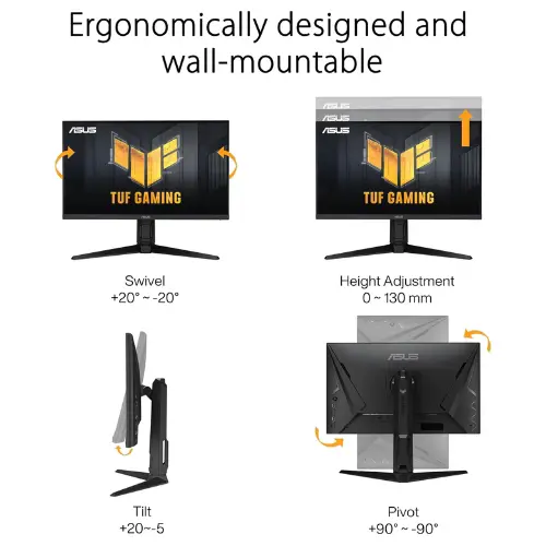 Ergonomics, Tilt (+20° to -5°), Swivel (+20° to -20°), Pivot (+90° to -90°), Height Adjustment (0-130mm), VESA Wall Mount (100x100mm)