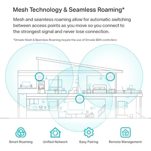 Omada Mesh Technology: Supports Omada Mesh for flexible and convenient wireless deployment, allowing EAPs to wirelessly connect to each other to extend Wi-Fi coverage further and simplify network expansion in challenging cabling scenarios.
