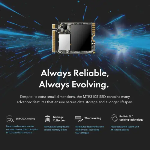 Advanced Reliability Features: The MTE310S incorporates advanced firmware optimization technologies, including SLC caching to accelerate burst write speeds and a robust LDPC (Low-Density Parity Check) ECC mechanism for powerful error correction. These features collectively enhance the drive's reliability and extend its operational lifespan.