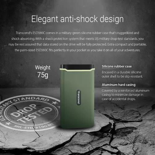 Military-Grade Shock Protection: Encased in a distinctive military green silicone rubber case, the ESD380C features a robust shock protection system that meets U.S. military drop-test standards (MIL-STD-810G 516.6). This ensures exceptional durability and safeguards your data against accidental drops and impacts.